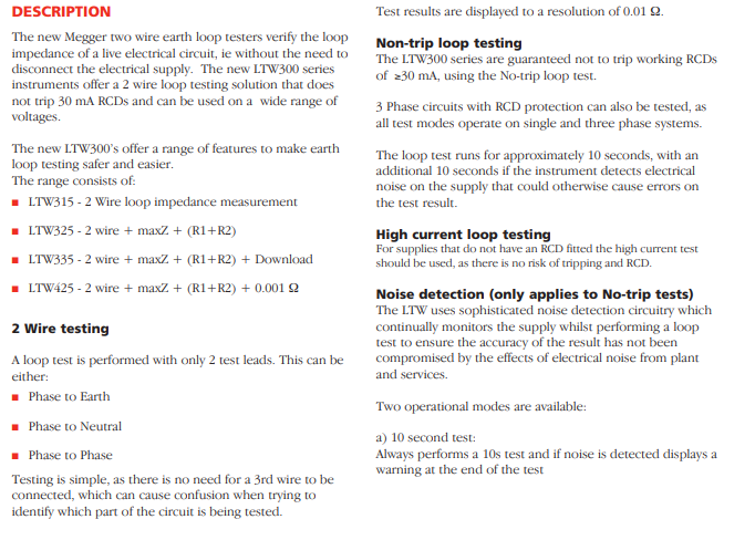 全新的Megger双线接地回路测试仪可以在不需要切断供电的情况下验证带电电路的阻抗。全新的LTW300系列提供了高分辨率的双线回路测试方案,可以在广泛的电压范围下使用,不会使30 mA RCD跳闸。