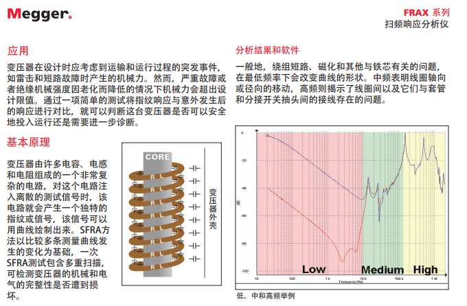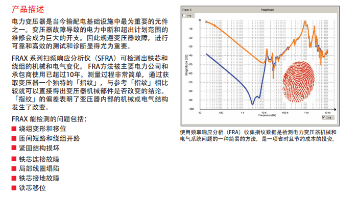 FRAX 系列扫频响应分析仪(SFRA) 能侦测其它方法无法侦测到的潜在机械和电气问题。许多电网公司和服务公司使用FRA方法测试变压器已经有超过十年的时间。通过简易的测量步骤,仪器会捕捉变压器的独特「指纹」,通过测量结果与参考「指纹」的比较,可以看出变压器的「指 纹」是否有改变。若有改变则暗示了变压器内部的机械和/或电气结构有所改变。