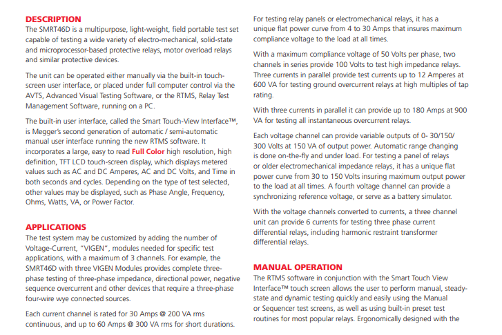 SMRT46D 是一款多功能、轻型便携式现场设备,能够测试各种机电保护、固态保护和基于微处理器的保护继电器、电机过载继电器和其它类似的保护设备。