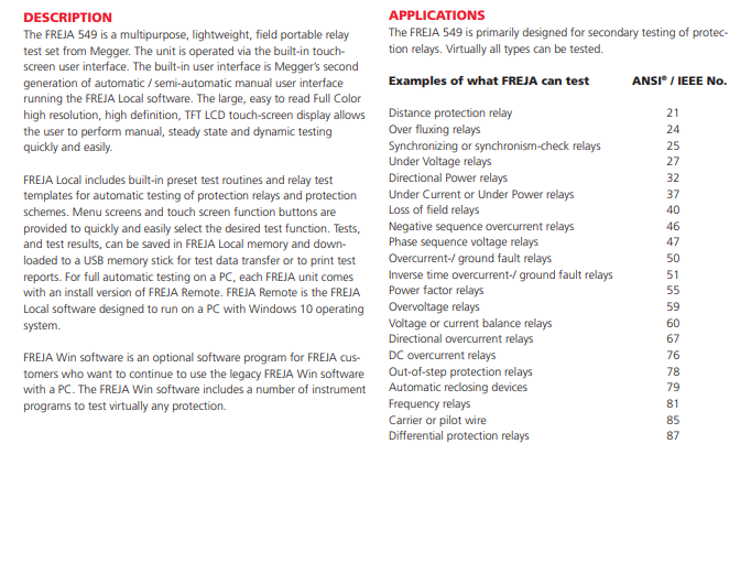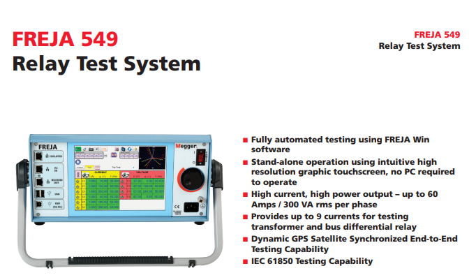 FREJA549 拥有高输出电压和大电流的“智能”组合,前者用以测试高抗阻接地故障继电器,后者用于测试所有机电、固态和数字过流继电器,其中包括电压控制过流保护、电压抑制过流保护和方向过流保护。
