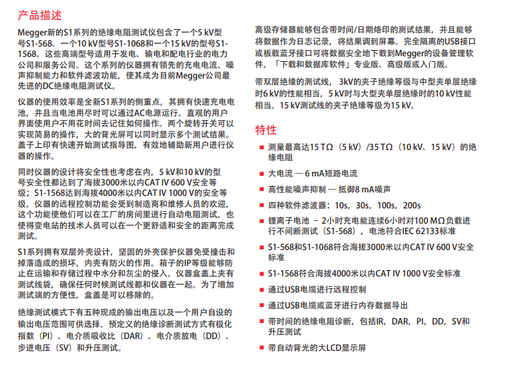 新的15 kV S1-1568绝缘电阻测试仪适用于发电、输电和配电行业的电力公司和服务公司。仪器拥有领先的充电电流、噪声抑制能力和软件滤波功能,使其成为目前Megger公司最先进的DC绝缘电阻测试仪。